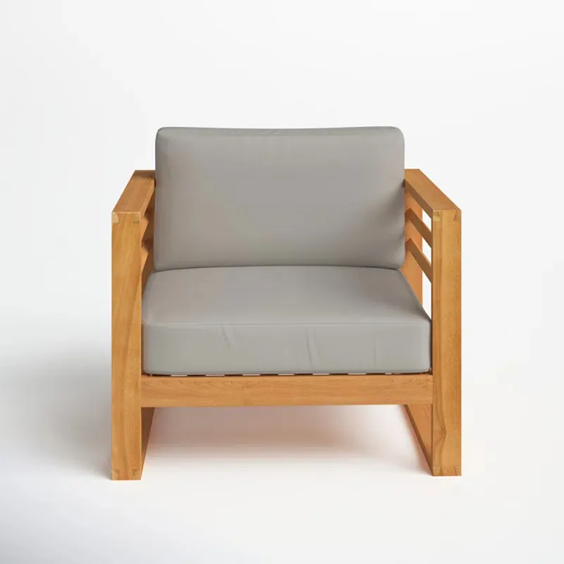 Den beste egenskapen til dette utendørs trestolsettet er dets modulære design, som lar brukere enkelt rekonfigurere hele settet i henhold til deres behov. Enten det er for en spesifikk sosial begivenhet eller bare for å endre stemningen, er omorganisering raskt og enkelt. Denne designen oppfyller ikke bare individuelle behov, men eliminerer også den økonomiske byrden ved hyppige kjøp av nye møbler. Hvert møbel er laget av utvalgte værbestandige materialer, noe som sikrer at det beholder sin holdbarhet og utseende i varmt og kaldt klima. Sofaens seteputer er dekket med vanntett og UV-bestandig høyytelsesstoff. Dette beskyttende laget forhindrer effektivt skade fra regn og direkte sollys, og forlenger møblenes levetid betydelig.