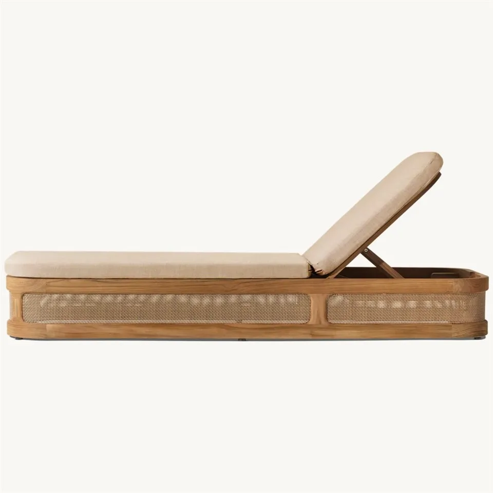 Denne moderne sjeselongen i flettet kombinerer moderne minimalistisk design med klassikere, og er en kollisjon mellom innovasjon og tradisjon. Designet på denne loungestolen er både klassisk og moderne, og teakstrukturen legger grunnlaget for en følelse av mote. Sammen med det håndvevde kurvnettet er det utsøkt, ensartet i tetthet, flatt i tykkelse, sterkere og mer elastisk, tar hensyn til både skjønnhet og praktisk, ikke bare visuelt presentere et rikt lag av vekslende virtuelt og ekte, men også økende pusteevne. Selv i et fuktig miljø kan kurven tørkes raskt i tide for å sikre brukervennligheten.