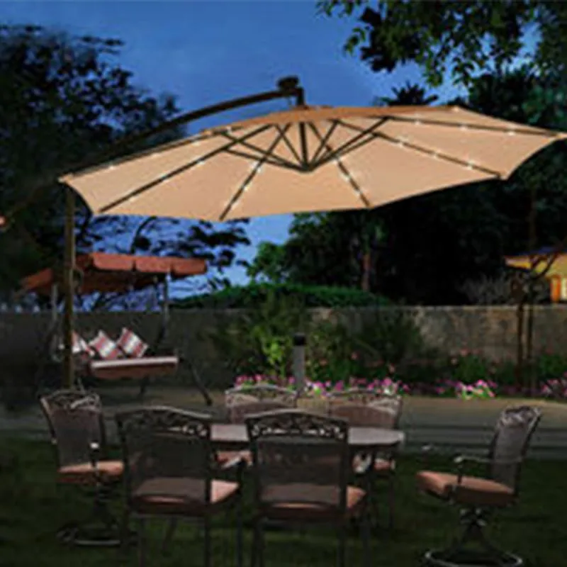 For ekstra bekvemmelighet og komfort har den grå utkragende paraplyen med lys LED-lyselementer, som ikke bare gir god solbeskyttelse på dagtid, men som også forvandles til myke lys om natten for å følge deg, og forsterker moroa og elegansen ved utendørsaktiviteter.