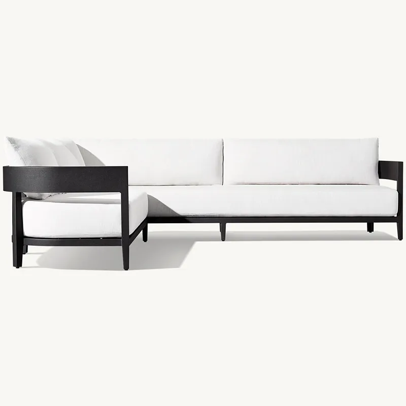 Vår utendørs seksjonssofa i aluminium er konstruert av førsteklasses aluminium, kjent for sine lette, men solide egenskaper. Aluminiumsrammen er behandlet med et pulverbelegg for å motstå rust og korrosjon, noe som sikrer at den tåler ulike værforhold fra intens sol til regnbyger. Denne holdbare konstruksjonen lar deg nyte utendørsmiljøet året rundt uten bekymringer om slitasje.